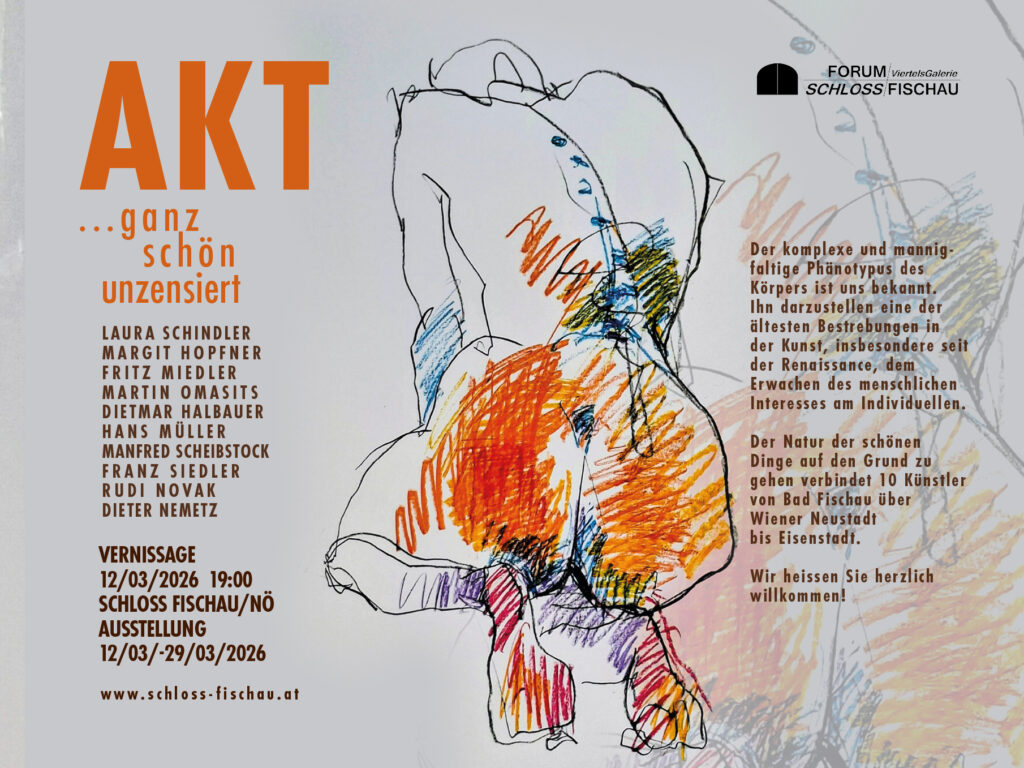 Blau Gelbe Viertelsgalerie AKT - ganz schön unzensiert Künstlerkreise Wiener Neustadt und Fischau Vernissage: 12. März 2026, 19 UhrAusstellungsdauer: bis 29. MärzÖffnungszeiten: Samstag und Sonntag von 17 - 19 Uhr undgegen Voranmeldung unter 0664 441 8770